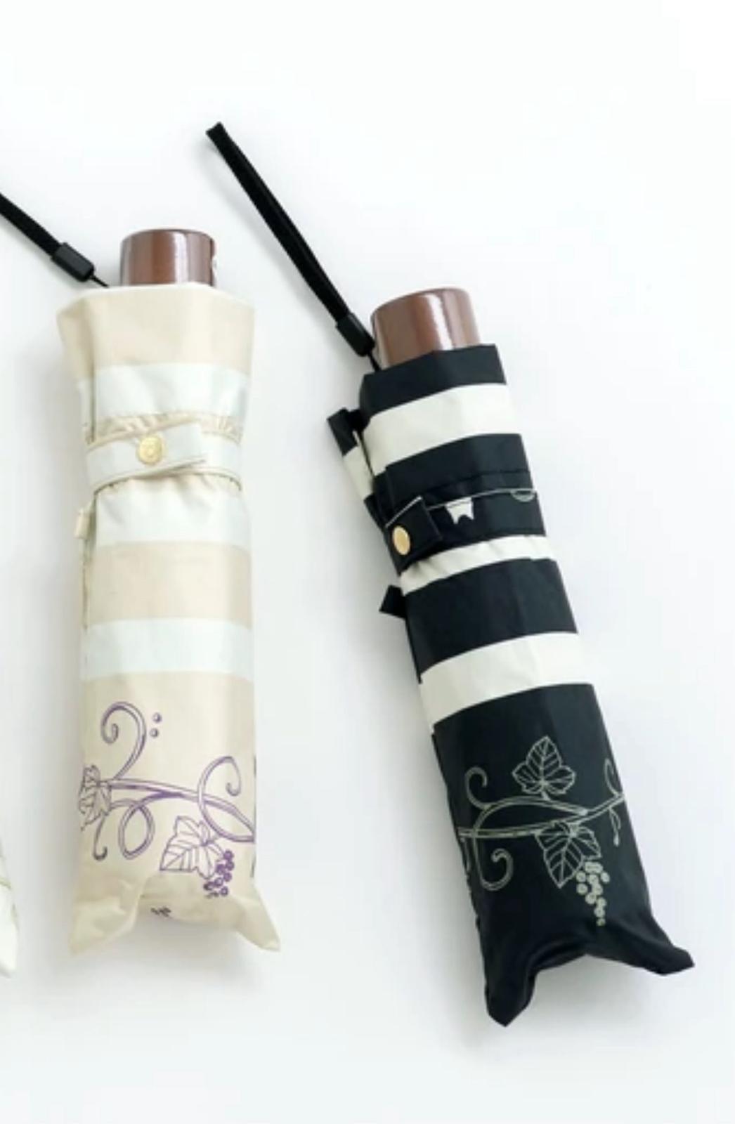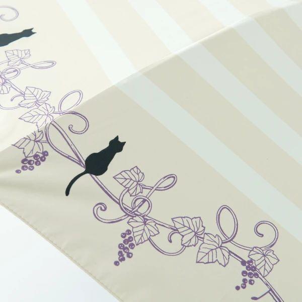 條紋印花,葡萄藤紋圖案上放著一點的小貓,是大人可愛的晴雨兼用摺疊傘。